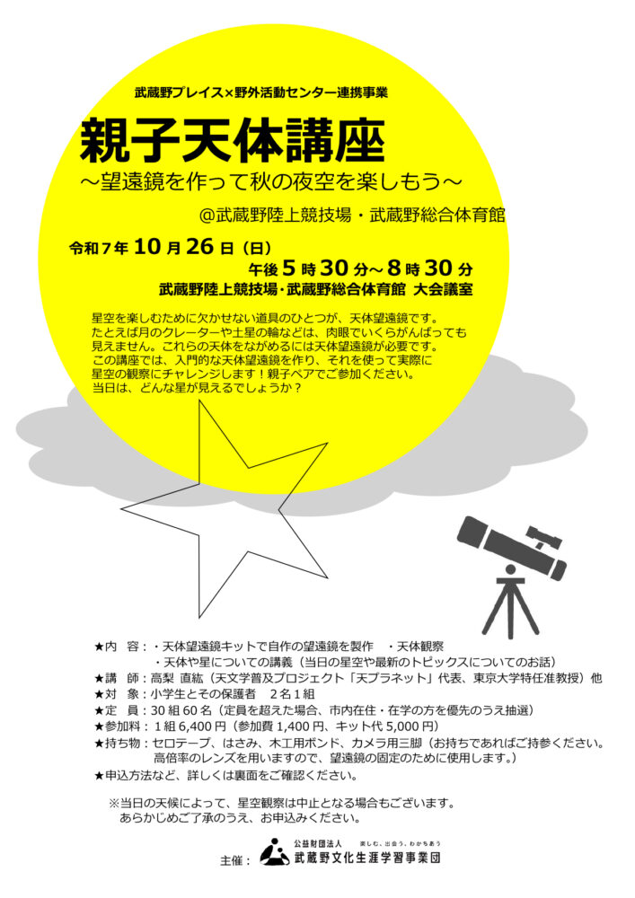 武蔵野プレイス×野外活動センター連携事業 「親子天体講座~望遠鏡を作って秋の夜空を楽しもう~@武蔵野陸上競技場・武蔵野総合体育館」