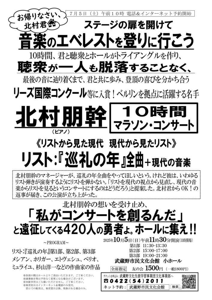 【第1部】11:30-13:30 F.リスト:≪旅人のアルバム≫S.156より 山の夕べ(エルンスト・クノップによる)-田園風夜想曲 O.メシアン:≪鳥のカタログ≫第1巻より 第1曲 キバシガラス(アルプスのチャフ) H.ホリガー:≪こどものひかり≫より 第5曲 黒と白のヨーデル重唱 休憩 F.リスト:巡礼の年第1年「スイス」S.160 【第2部】15:00-17:00 C.ドビュッシー:夜想曲 P.エトヴェシュ:地のクラヴィーア-天のクラヴィーア(ルチアーノ・ベリオの思い出に) L.ベリオ:セクエンツァIV 休憩 F.リスト:巡礼の年第2年「イタリア」S.161 【第3部】19:00-21:00 T.ミュライユ:告別の鐘と微笑み-オリヴィエ・メシアンの追憶に 杉山洋一:山への別れ (休憩) F.リスト:巡礼の年第3年 S.163