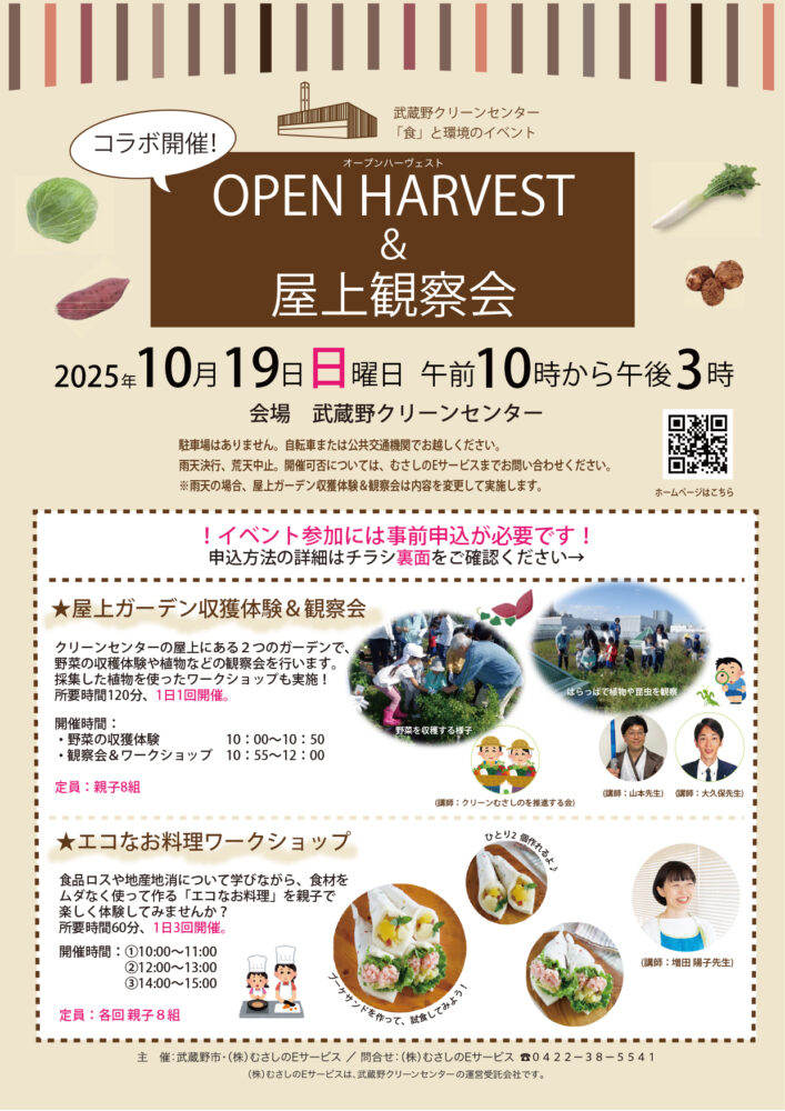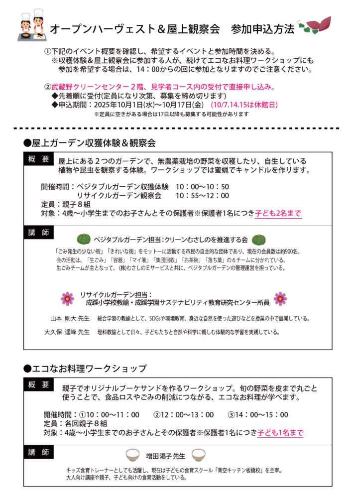 無料 〈屋上ガーデン収穫体験&観察会〉 時間:10:00〜12:00 対象:4歳〜小学6年生までのお子さんと保護者 ※保護者1名につき子ども2名まで 定員:親子8組(申込み終了) 〈エコなお料理ワークショップ〉 時間:1回目10:00〜11:00/2回目12:00〜13:00/3回目14:00〜15:00(3回目は申し込み終了) 対象:4歳〜小学6年生までのお子さんと保護者 ※保護者1名につき子ども1名まで 定員:各回親子8組まで