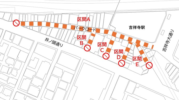 吉祥寺パークエリアには、市民やまちの関係者とともにまちづくりの取組方針となる「吉祥寺パークエリアまちの将来像」の立案が求められています。まちづくりに対する機運醸成やまちの将来像につながる要素の抽出等を目的として、パークロードや周辺の公共空間などを活用した社会実験を実施します。