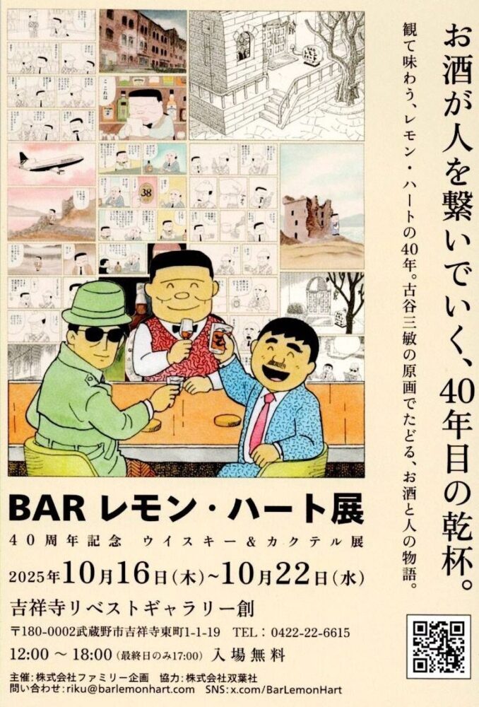 古谷三敏『BAR レモン・ハート展』 開催日 2025年10月16日(木)〜22日(水) 時間 12:00~18:00(最終日17:00まで) 会場 リベストギャラリー創〒180-0002 武蔵野市吉祥寺東町1-1-19 Web https://libestgallery.jp/2025-10-16/