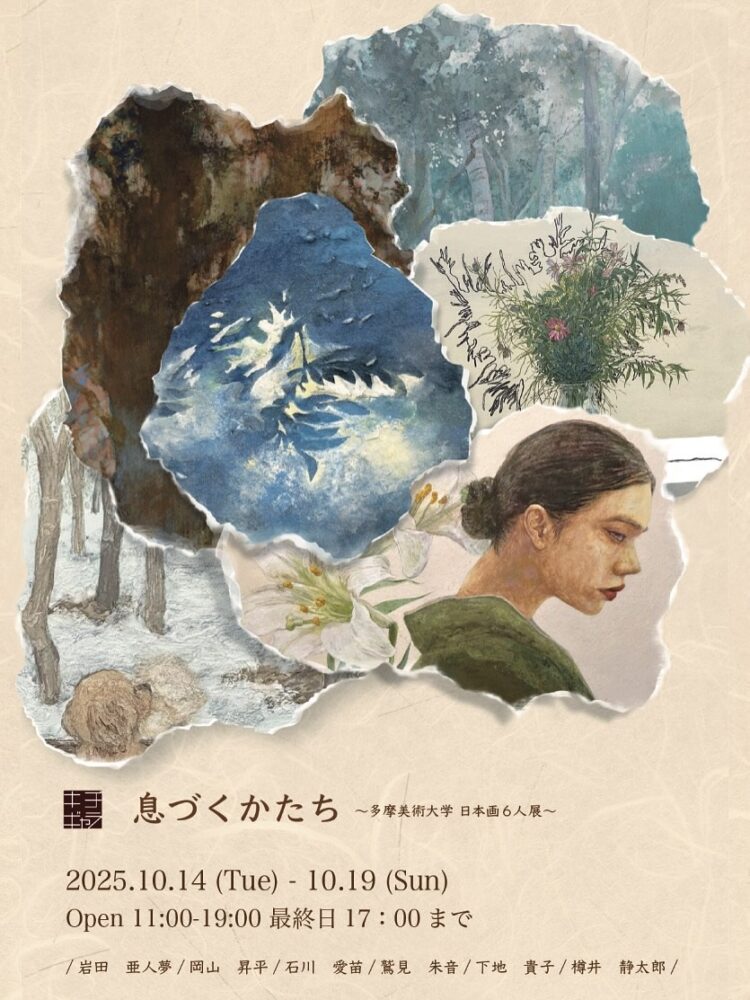 息づくかたち 〜多摩美術大学 日本画6人展〜 開催日 2025年10月14日(火)〜19日(日) 時間 11:00〜19:00(最終日17:00まで) 会場 キチジョウジギャラリー〒181-0001 東京都三鷹市井の頭3-32-16 セブンスターマンション105R中央線・吉祥寺駅徒歩9分 京王井の頭線・井の頭公園駅徒歩1分 Web http://kichijojigallery.com/?p=12230