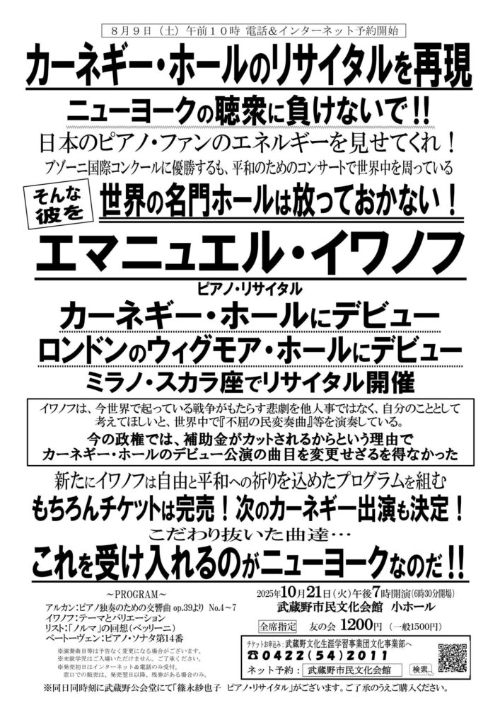 L.v.ベートーヴェン:ピアノソナタ第14番「月光」Op. 27, No. 2 C.V.アルカン:ピアノ独奏のための交響曲op.39より No.4~7 休憩 E.イワノフ:テーマとヴァリエーション F.リスト:ベッリーニ「ノルマ」の回想 S394/R133