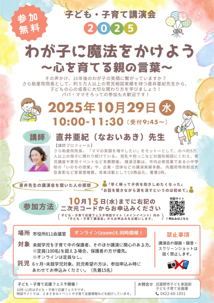 子ども・子育て講演会「わが子に魔法をかけよう~心を育てる親の言葉~」 開催日 2025年10月29日(水) 時間 10:00〜11:30 料金など 対象:未就学児を子育て中の保護者・そのほか講演に関心のある方 定員:約100名(申込制・抽選)※オンラインは定員なし 会場:武蔵野市役所 811会議室 ※オンライン(zoom)も同時開催 会場 武蔵野市役所〒180-8777 東京都武蔵野市緑町2-2−28 Web https://www.city.musashino.lg.jp/shussan_kodomo_kyoiku/kodomo_kosodate/event_kodomokatei/event_kodomokosodateshien/1052245.html