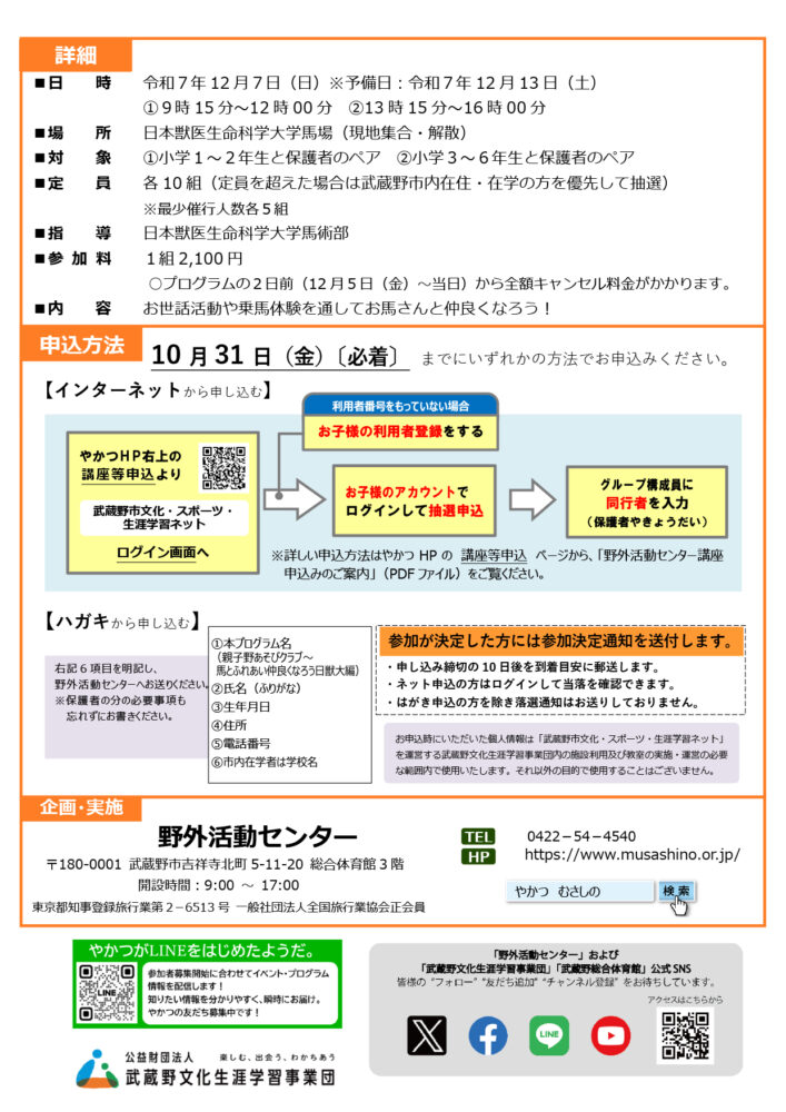 1組2,100円 対象:(1)小学1~2年生とその保護者(2)小学3~6年生とその保護者 ※どちらも親子2人で1組 定員:各10組(申込制・抽選) 会場:日本獣医生命科学大学 馬場(現地集合・解散)