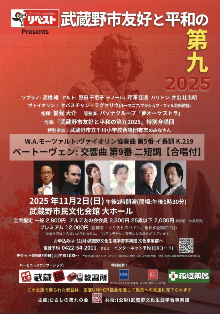 指揮:曽我大介 高橋維(ソプラノ) 野田千恵子(アルト) 芹澤佳道(テノール) 井出壮志朗(バリトン) セバスチャン・テグセリウ(ヴァイオリン/ルーマニア・ブラショフ・フィル芸術監督) パソナグループ「夢オーケストラ」(管弦楽) 『武蔵野市友好と平和の第九2025』特別合唱団(合唱) 特別参加:武蔵野市立千川小学校合唱団有志の皆さん