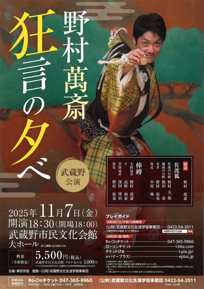 解説:野村萬斎 《佐渡狐》 佐渡の百姓 野村 太一郎 越後の百姓 飯田 豪 奏者 野村 裕基 後見 中村 修一 《棒縛》 太郎冠者 野村 萬斎 主 高野 和憲 次郎冠者 深田 博治 後見 野村 裕基