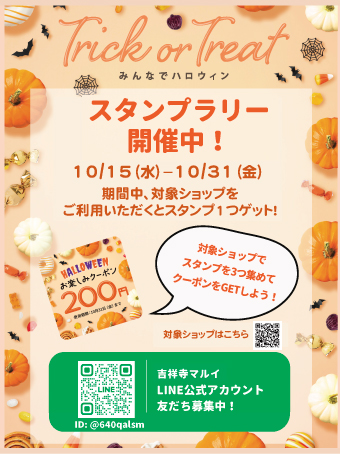 Trick or Treat! みんなでハロウィンスタンプラリー 開催日 2025年10月15日(水)〜31日(金) 会場 吉祥寺マルイ〒180-0003 東京都武蔵野市吉祥寺南町1-7-1 Web https://www.0101.co.jp/016/news/detail.html?article_seq=138334&article_type=sto