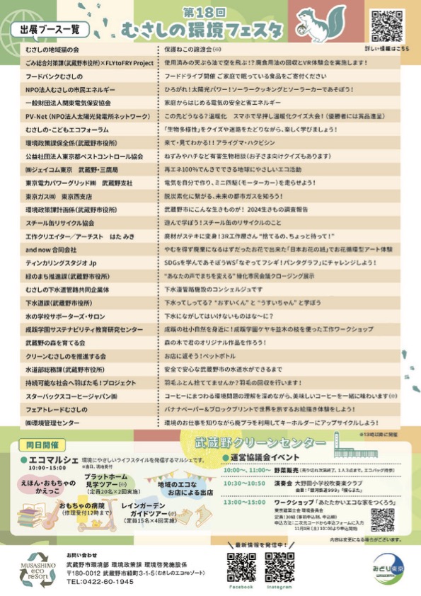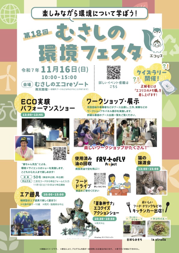 ◆10:30〜10:50「蒼象神ザナ」エコクイズアクションショー ◆13:00〜13:45 ECO実験パフォーマンスショー ◆13:00〜猫の譲渡会(むさしの地域猫の会) ◆①10:30~、②11:15~、③13:00~、④13:45~、⑤14:30~廃材がステキに変身!3R工作屋さん”捨てるの、ちょっと待って!”(工作クリエイター/アーチスト はた みき)