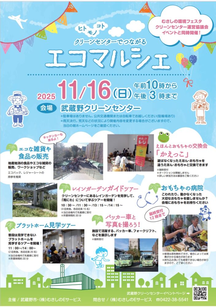 第21回エコマルシェ 開催日 2025年11月16日(日) 時間 10:00〜15:00 会場 武蔵野クリーンセンター東京都武蔵野市緑町3丁目1番5号 プログラム えほん・おもちゃのかえっこ おもちゃの病院(修理受付12:00まで) プラットホーム見学ツアー(定員20名×2回実施 ※当日現地受付) レインガーデンガイドツアー(定員15名×4回実施 ※当日現地受付) 地域のエコなお店による出店 Web https://mues-ebara.com/event/info.php?id=181