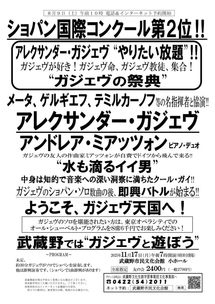 前半はガジェヴのソロ演奏(ショパン作品)をもとに、ミアッツォンが即興。 後半はお客さまからのリクエストをもとに、2台ピアノ即興! 演奏者とのインタラクティブかつクリエイティブな時間をお楽しみください! 前半 オール・ショパン・プログラム F.F.ショパン:マズルカ ヘ短調 Op.63-2 F.F.ショパン:《24のプレリュード(前奏曲集)》より 前奏曲 第4番 ホ短調 Op.28-4 F.F.ショパン:ノクターン第4番 ヘ長調 Op.15-1 F.F.ショパン:バラード 第4番 ヘ短調 Op.52 F.F.ショパン:マズルカ(遺作) イ短調 Op.68-2 F.F.ショパン:マズルカ 嬰ヘ短調 Op.6-1 F.F.ショパン:プレリュード 嬰ハ短調 Op.45 F.F.ショパン:《24のプレリュード(前奏曲集)》より 前奏曲 第24番 ニ短調 Op.28-24