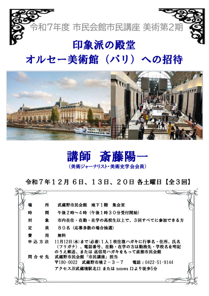 令和7年度 市民講座(美術2期)「印象派の殿堂 オルセー美術館(パリ)への招待」