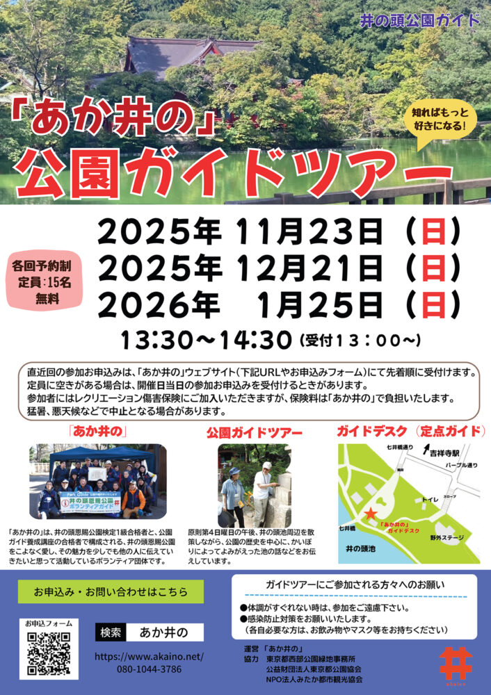 [運営]井の頭恩賜公園ボランティアガイド「あか井の」 [協力]東京都西部公園緑地事務所/(公財)東京都公園協会/NPO法人みたか都市観光協会