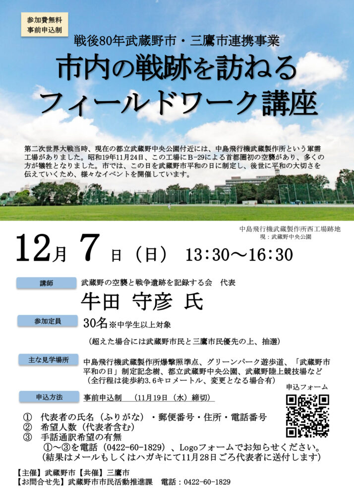対象:中学生以上 定員30人(申込み多数の場合は、武蔵野市民及び三鷹市民を優先に抽選) 会場:武蔵野市内の戦跡