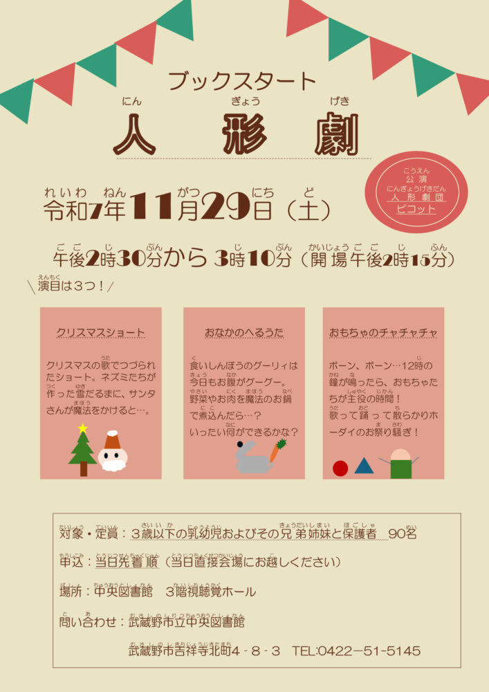 ブックスタート人形劇 「クリスマスショート」「おなかのへるうた」「おもちゃのチャチャチャ」