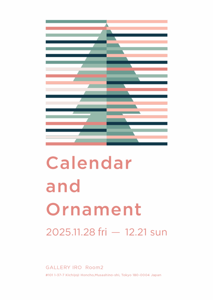 Calendar & Ornaments 開催日 2025年11月28日(金)〜12月21日(日)※金土日のみ営業(12/1〜4、12/8〜11、12/15〜18休み) 時間 12:00〜18:00(最終日17:00まで) 会場 GALLERY IRO〒180-0004 東京都武蔵野市吉祥寺本町1-37-7-101 吉祥寺駅より西荻窪方面へ歩いて7分程度、五日市街道沿い。 Web https://1-6.jp/cao2526