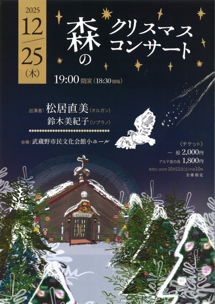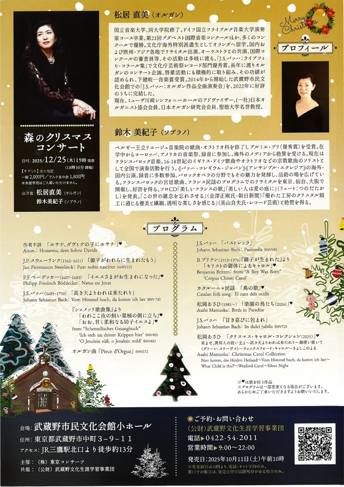 作者不詳:「ホサナ、ダヴィデの子にホサナ」♥ J.P.スウェーリンク (1562–1621):「御子がわれらに生まれたもう」 P.F.ベーデッカー (1607–1683):「イエスさまがお生まれになった」♥ J.S.バッハ (1685–1750):「高き天よりわれは来たれり」 J.S.バッハ:『シェメッリ歌曲集』より「われここ汝の飼い葉桶の側に立ち」♥ /「おお、甘く柔和なる幼子イェスよ」 J.S.バッハ:Piece d’Orgue BWV572 J.S.バッハ:「パストレッラ」 B.ブリテン (1913–1976):『御子が生まれた』より「キリストの御体によるキャロル」♥ カタルーニャ民謡「鳥の歌」♥ 松岡あさひ (1985–):「楽園の鳥たち (2024)」♥ J.S.バッハ:「甘き喜びに包まれ」 松岡あさひ:『クリスマス・キャロル・コレクション (2025)』♥ 来ませ、異邦人の救い主よ〜高き天よりわれは来たれり〜御使い歌いて (グリーン・スリーヴス)〜ウェックスフォード・キャロル〜きよしこのよる ※♥は歌を伴う作品