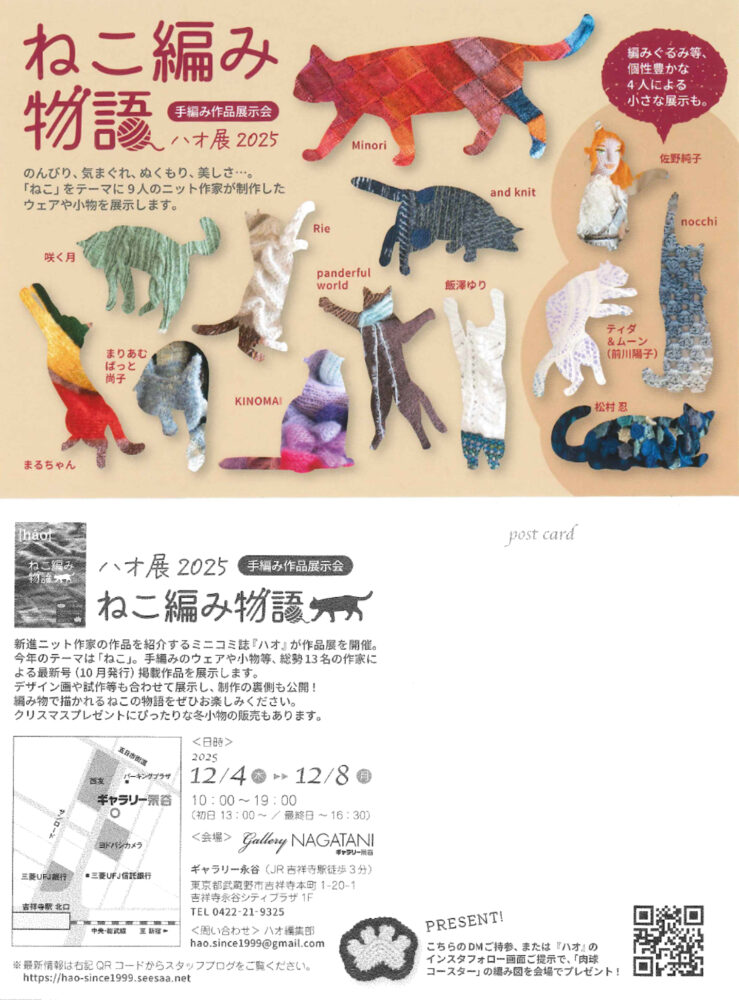 ハオ展2025 ねこ編み物語 開催日 2025年12月4日(木)~8日(月) 時間 10:00~19:00(初回13:00から、最終日16:30まで) 会場 ギャラリー永谷 Web http://www.ntgp.co.jp/rentalspace/gallery.html Instagram @hao_since1999
