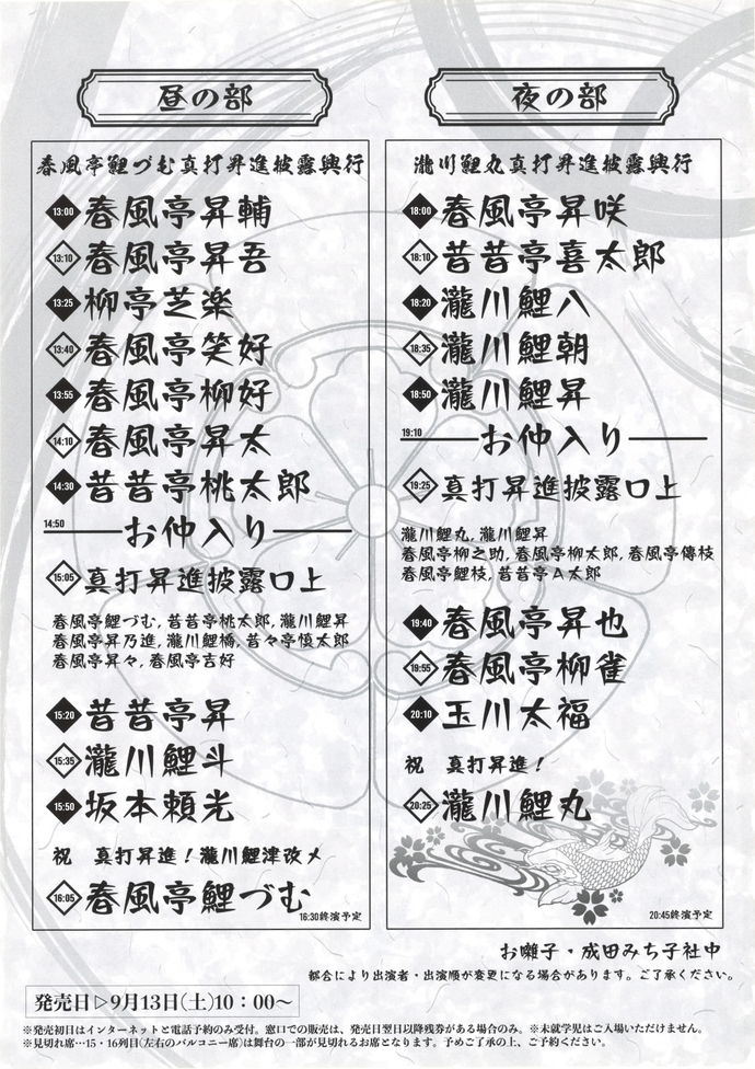 昼の部13:00〜(開場12:30分、16:30頃終演予定) 夜の部18:00〜(開場17:30、20:45頃終演予定)