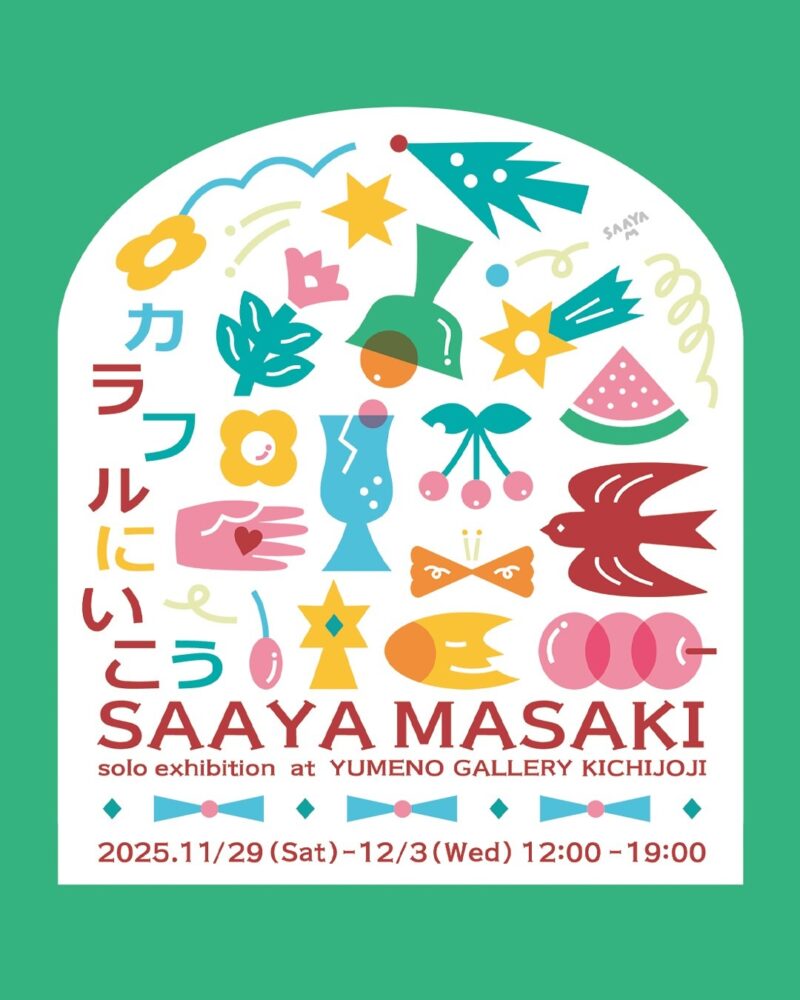 SAAYA MASAKI solo exhibition —カラフルにいこう— 開催日 2025年11月29日(土)〜12月3日(水) 時間 12:00〜19:00(最終日18:00まで) 会場 ユメノギャラリー吉祥寺〒180-0002 東京都武蔵野市吉祥寺東町1-5-13 はぴすと押山2F Web https://www.yumenogallerykichijoji.com/schedule/ Instagram @saayamasaki