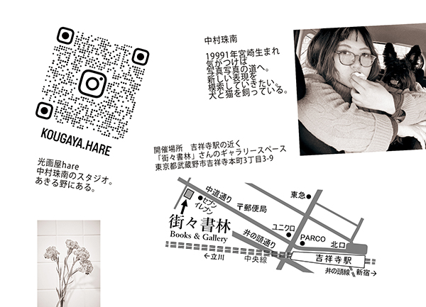 写真?展「ナーサリーライム」 開催日 2025年11月28日(金)〜30日(日) 時間 12:34〜18:00 会場 街々書林 Books & Gallery〒180-0004 東京都武蔵野市吉祥寺本町3-3−9 Web https://machi2.hp.peraichi.com/tabi/ X @machi2syorin Facebook www.facebook.com/machi2syorin Instagram @machi2syorin
