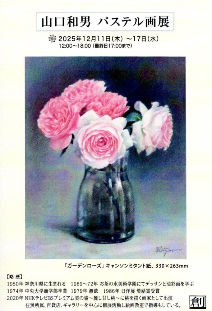 山口和男 パステル画展 開催日 2025年12月11日(木)〜17日(水) 時間 12:00~18:00(最終日17:00) 会場 リベストギャラリー創〒180-0002 武蔵野市吉祥寺東町1-1-19 Web https://libestgallery.jp/2025-12-11/