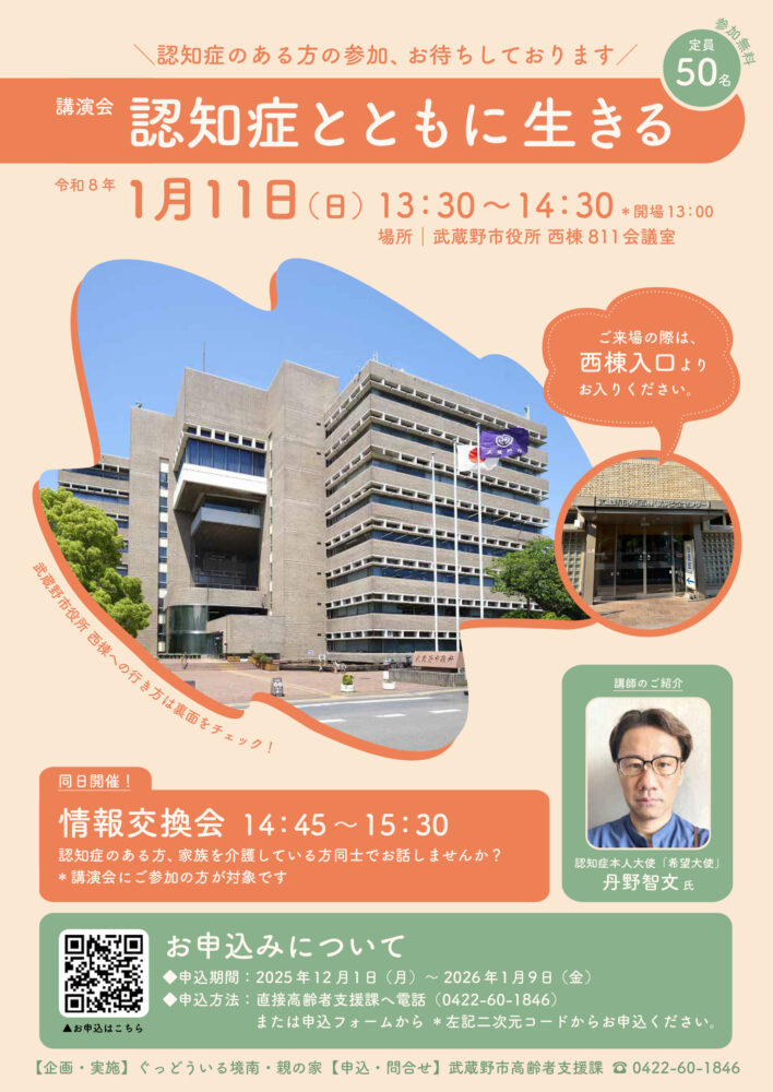 対象:武蔵野市内在住・在勤・在学で認知症のある方、介護している方、介護に関心のある方 定員:50名(申込制・先着順) 会場:811会議室