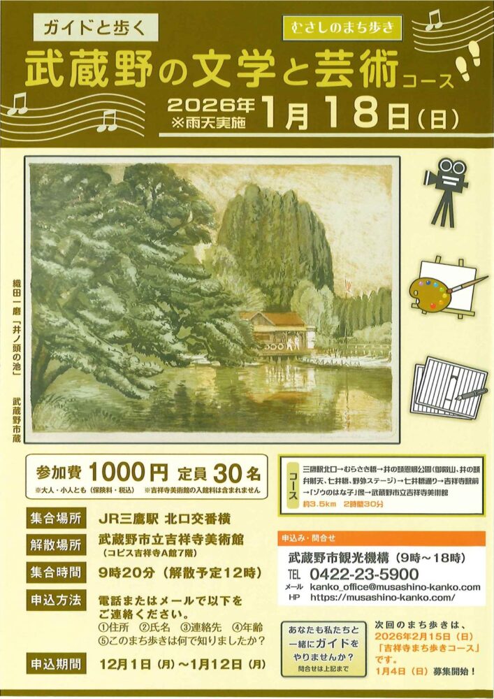 1,000円(保険料) ※大人・小人とも、吉祥寺美術館の入館料は含まれません。 定員:30名(申込制・先着順) 集合:JR三鷹駅 北口交番横 解散:武蔵野市立吉祥寺美術館