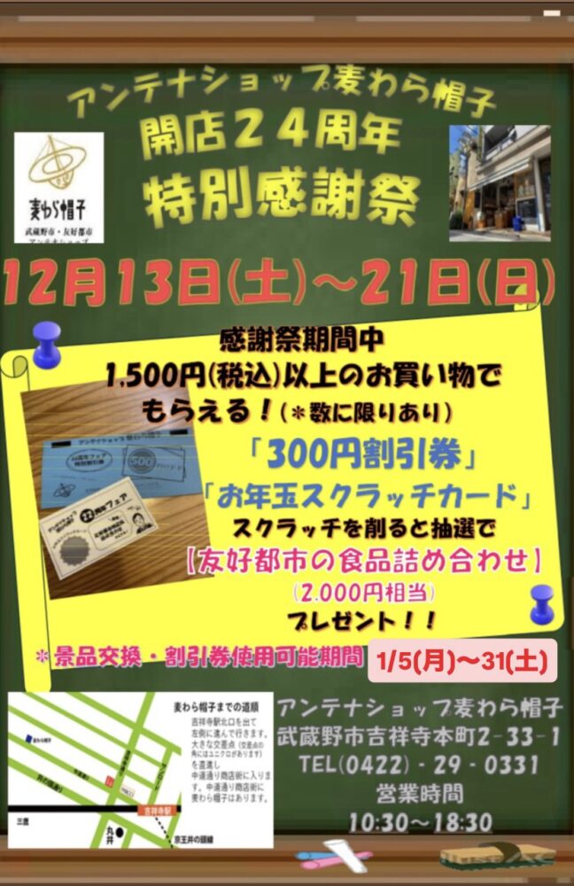 アンテナショップ麦わら帽子24周年フェア 開催日 2025年12月13日(土)〜21日(日) 時間 10:30〜18:30 料金など 対象:24周年フェア開催期間中、1回のお買い上げ金額が1,500円以上の方 ※スクラッチカード・割引券はなくなり次第、配布を終了 会場 アンテナショップ麦わら帽子〒180-0004 武蔵野市吉祥寺本町2-33-1 Web https://www.city.musashino.lg.jp/kurashi_tetsuzuki/shigoto_sangyo/shoko/1048940.html