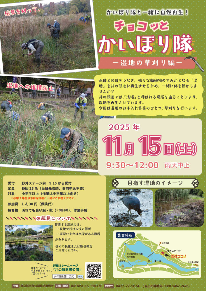 参加費 1人 30円(保険代) 対象:小学生以上(作業は中学年以上向き)※小学3年生以下は保護者同伴 定員:25名程度(当日先着順、事前申込不要) 持ち物:汚れても良い服・靴、作業手袋 ※池の中には入りません ※当日9:15から野外ステージ前にて受付