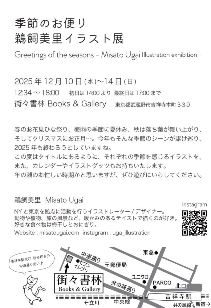 季節のお便り 鵜飼美里イラスト展 開催日 2025年12月10日(水)〜14日(日) 時間 12:34〜18:00 会場 街々書林 Books & Gallery〒180-0004 東京都武蔵野市吉祥寺本町3-3−9 Web https://machi2.hp.peraichi.com/tabi/ X @machi2syorin Facebook www.facebook.com/machi2syorin Instagram @machi2syorin