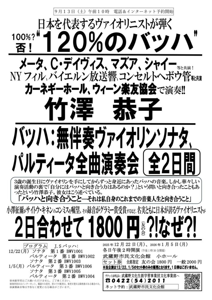 2025年12月22日 【1日目】 J.S.バッハ:無伴奏ヴァイオリン・ソナタ 第1番 ト短調 BWV1001 J.S.バッハ:無伴奏ヴァイオリン・パルティータ 第1番 ロ短調 BWV1002 J.S.バッハ:無伴奏ヴァイオリン・ソナタ第2番 イ短調 BWV1003 2026年1月5日 【2日目】 J.S.バッハ:無伴奏ヴァイオリン・パルティータ第3番 ホ長調 BWV1006 J.S.バッハ:無伴奏ヴァイオリン・ソナタ第3番 ハ長調 BWV1005 J.S.バッハ:無伴奏ヴァイオリン・パルティータ第2番 ニ短調 BWV1004