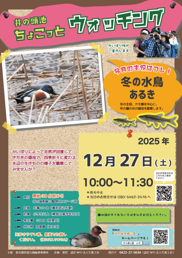 かいぼりによって四季折々の生きものでにぎわうようになった井の頭池で、水辺の生きものを観察してみませんか? 12月は水鳥を中心に冬の井の頭池を散策します。