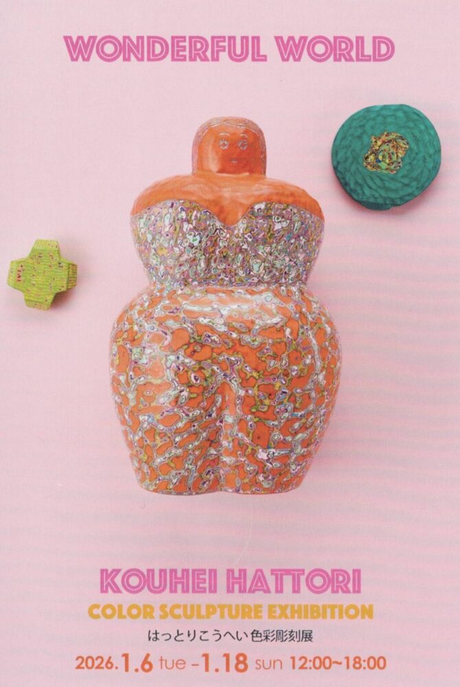 『WONDERFUL WORLD』はっとりこうへい色彩彫刻展 開催日 2026年1月6日(火)~18日(日) 時間 12:00~18:00(最終日17:00まで) 会場 リベストギャラリー優〒180-0004 東京都武蔵野市吉祥寺本町2-26-10-1F Web https://libestgallery.jp/2026-01-06/