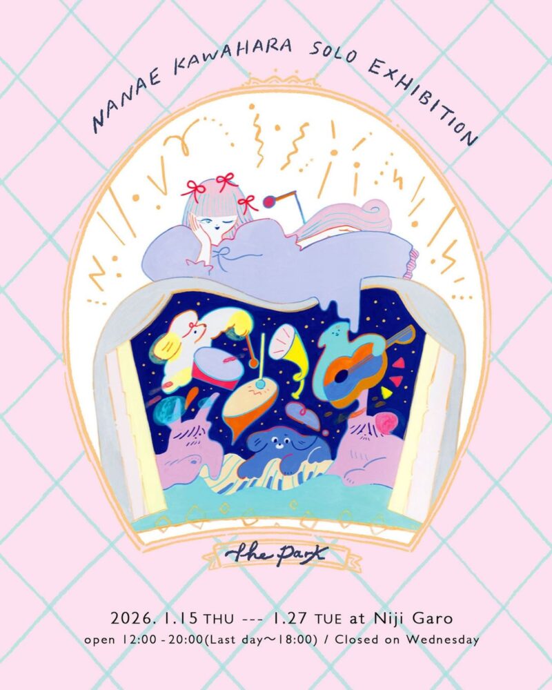 河原奈苗個展 The PARK 開催日 2026年1月15日(木)〜27日(火)※水曜定休 時間 12:00〜20:00(最終日18:00まで) 会場 にじ画廊〒180‐0004 東京都武蔵野市吉祥寺本町2‐2‐10 JR中央線 吉祥寺駅より徒歩4分 Web http://nijigaro.com/exhibition.htm