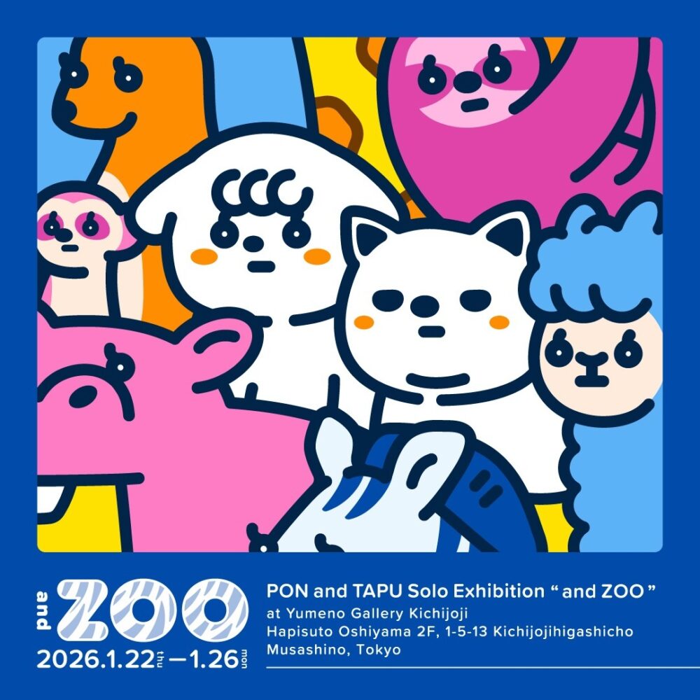 PON and TAPU 個展「and ZOO」 開催日 2026年1月22日(木)〜26日(月) 時間 13:00〜20:00(最終日18:00まで) 会場 ユメノギャラリー吉祥寺〒180-0002 東京都武蔵野市吉祥寺東町1-5-13 はぴすと押山2F Web https://www.yumenogallerykichijoji.com/schedule/ Instagram @ponandtapu