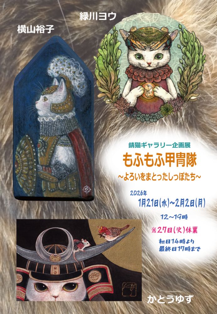 錆猫ギャラリー企画展 「もふもふ甲冑隊〜よろいをまとったしっぽたち〜」 開催日 2026年1月21日(水)〜2月2日(月)※1月27日(火)休み 時間 12:00~19:00(初日14:00より、最終日17:00まで) 会場 錆猫ギャラリー〒180-0004 東京都武蔵野市吉祥寺本町2-33-1 Web https://sabineko-gallery.com/?p=23879