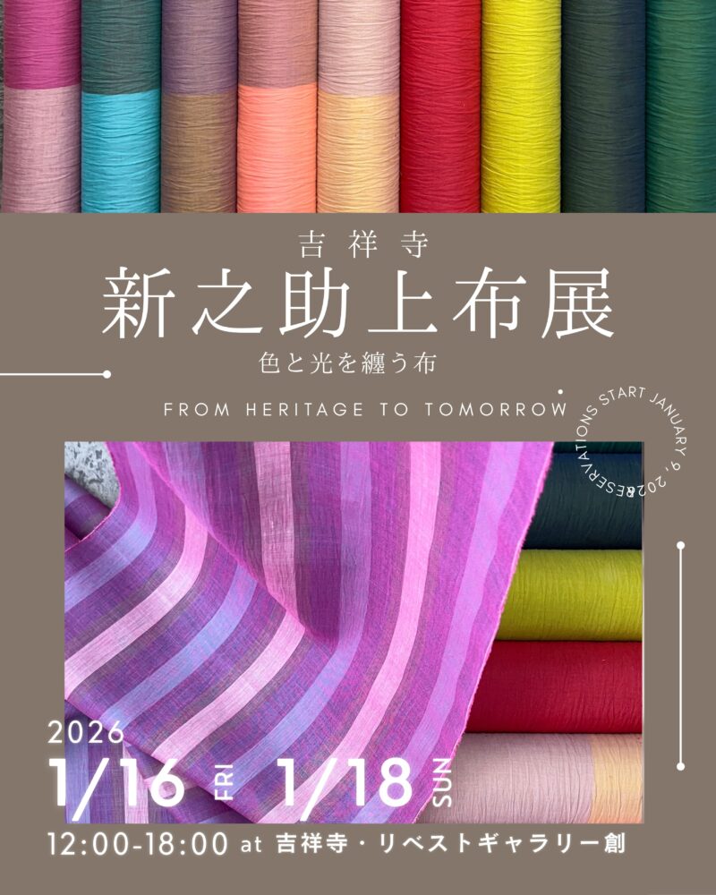 吉祥寺・新之助上布展 開催日 2026年1月16日(金)〜18日(日) 時間 1月16日(金)終日予約制 1月17日(土)12:00〜13:30予約制/14:00〜18:00予約不要 1月18日(日)12:00〜18:00予約不要 会場 リベストギャラリー創〒180-0002 武蔵野市吉祥寺東町1-1-19 Web https://libestgallery.jp/2025-11-25-2/