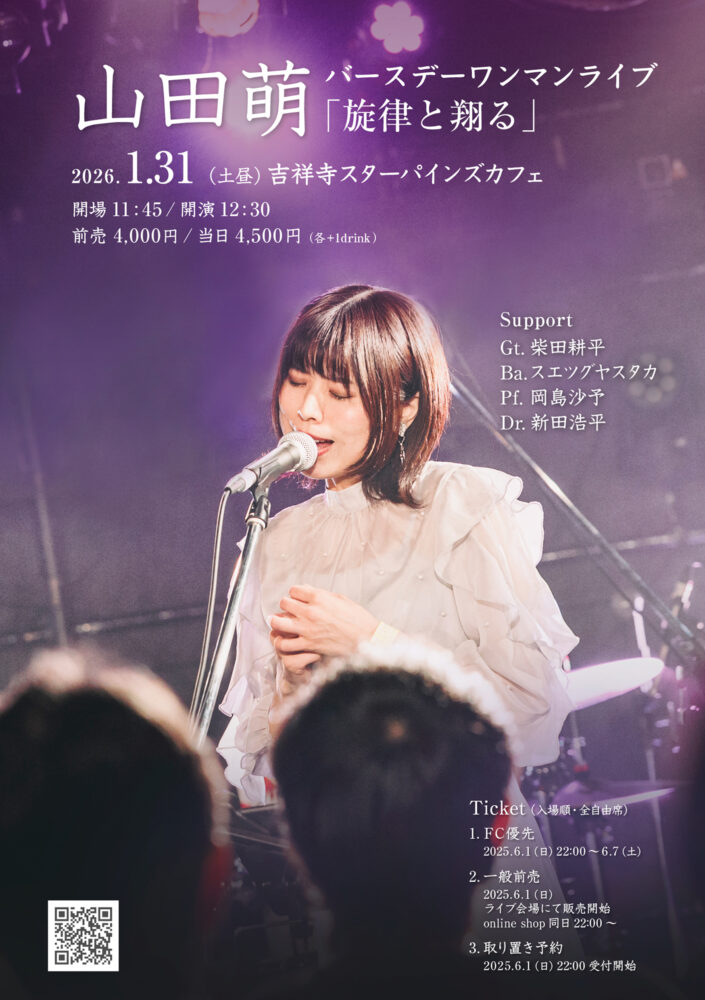 山田萌バースデーワンマンライブ「旋律と翔る」 開催日 2026年1月31日(土) 時間 開演12:30(開場11:45) 料金など 全席自由 前売:4,000円 当日:4,500円 (各+要1drink) 会場 スターパインズカフェ〒180-0004 東京都武蔵野市吉祥寺本町1-20-16 トクタケパーキングビルB1F Web https://mandala.gr.jp/SPC/schedule/20260131day/ X @_yamadamoe Instagram @yamadamoe_