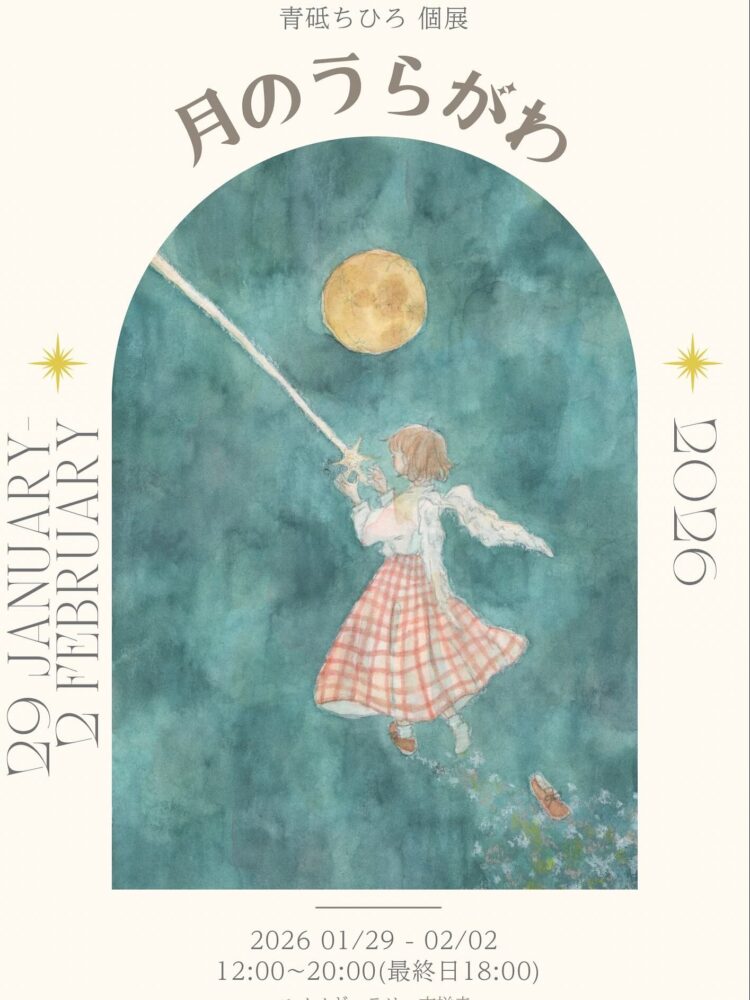 青砥ちひろ 個展「月のうらがわ」 開催日 2026年1月29日(木)〜2月2日(月) 時間 13:00〜20:00(最終日18:00まで) 会場 ユメノギャラリー吉祥寺〒180-0002 東京都武蔵野市吉祥寺東町1-5-13 はぴすと押山2F Web https://www.yumenogallerykichijoji.com/schedule/ Instagram @aochr323
