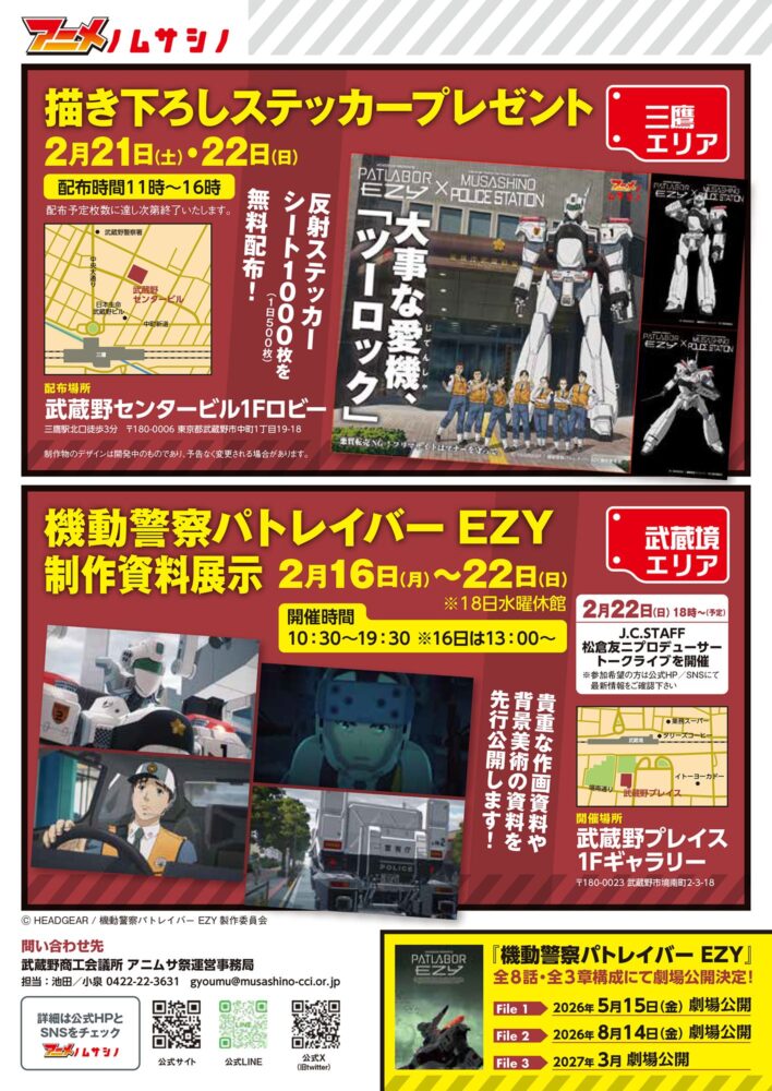 [主催]アニメノマンガノムサシノ実行委員会(武蔵野商工会議所/一般社団法人武蔵野市観光機構) [協力]武蔵野市、(一財)武蔵野市開発公社、武蔵野市商店会連合会、吉祥寺活性化協議会、三鷹駅北口商店会、武蔵境商店会連合会、㈱エフエムむさしの、㈱ジェイコム東京 武蔵野・三鷹局
