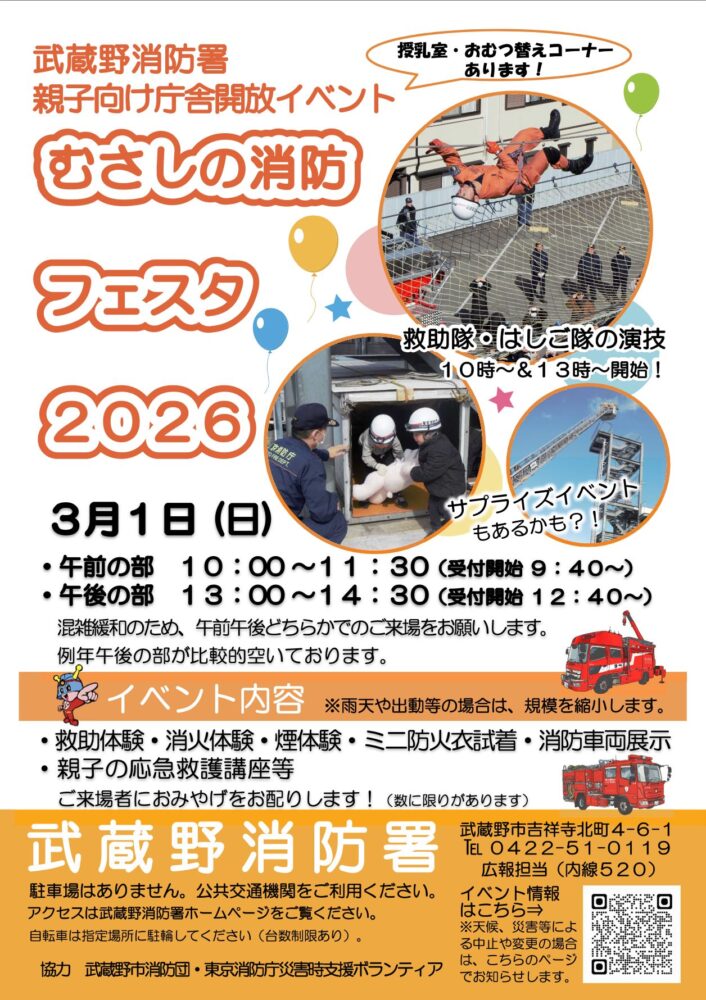 ・救助体験 ・消火体験 ・煙体験 ・ミニ防火衣試着 ・消防車両展示 ・親子の応急救護講座等