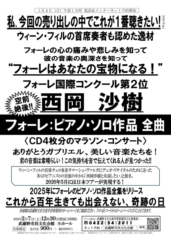 ガブリエル・フォーレ作曲 【1部】 3つの無言歌 op.17 バラード 嬰ヘ長調 op.19 マズルカ op.32 ヴァルス=カプリス 第1番 イ長調 op.30 ヴァルス=カプリス 第2番 変ニ長調 op.38 ヴァルス=カプリス 第3番 変ト長調 op.59 ヴァルス=カプリス 第4番 変イ長調 op.62 休憩 【2部】 即興曲第1番 変ホ長調 op.25 3つのノクターン より 第1番 変ホ短調 op.33-1 第2番 ロ長調 op.33-2 第3番 変イ長調 op.33-3 即興曲第2番 ヘ短調 op.31 即興曲第3番 変イ長調 op.34 ノクターン 第4番 変ホ長調 op.36 ノクターン 第5番 変ロ長調 op.37 ノクターン 第6番 変ニ長調 op.63 休憩 ノクターン 第7番 嬰ハ短調 op.74 ノクターン 第8番 変ニ長調 op.84-8 即興曲 第4番 変ニ長調 op.91 ノクターン 第9番 ロ短調 op.97 ノクターン 第10番 ホ短調 op.99 即興曲 第5番 嬰ヘ短調 op.102 ノクターン 第11番 嬰ヘ短調 op.104-1 ノクターン 第12番 ホ短調 op.107 ノクターン 第13番 ロ短調 op.119 休憩 【3部】 舟歌 第1番 イ短調 op.26 舟歌 第2番 ト長調 op.41 舟歌 第3番 変ト長調 op.42 舟歌 第4番 変イ長調 op.44 舟歌 第5番 嬰ヘ短調 op.66 舟歌 第6番 変ホ長調 op.70 舟歌 第7番 ニ短調 op.90 舟歌 第8番 変ニ長調 op.96 舟歌 第9番 イ短調 op.101 舟歌 第10番 イ短調 op.104-2 舟歌 第11番 ト短調 op.105 舟歌 第12番 変ホ長調 op.106bis 舟歌 第13番 ハ長調 op.116 休憩 【4部】 8つの小品 op.84 主題と変奏 嬰ハ短調 op.73 9つの前奏曲 op.103 パヴァーヌ op.50 即興曲 第6番 変ニ長調 op.86bis ※曲順は予定であり、予告なく変更になる場合がございます。ご了承ください。