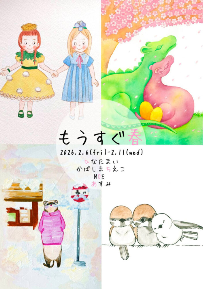 4人展 もうすぐ春 開催日 2026年2月6日(金)~11日(水) 時間 10:00~17:00(初回13:00~18:00、最終日16:00まで) ※曜日によって時間が変更になる場合あり お問い合わせ http://www.ntgp.co.jp/rentalspace/gallery.html 会場 ギャラリー永谷