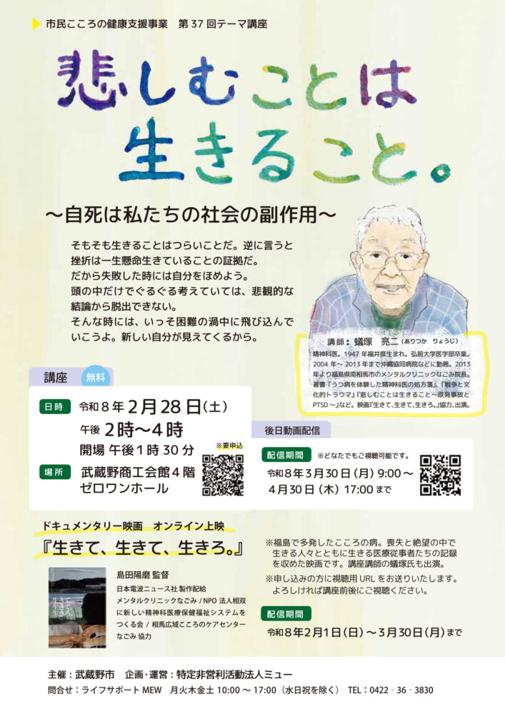 市民こころの健康支援事業 第37回テーマ講座「悲しむことは生きること。~自死は私たちの社会の副作用~」