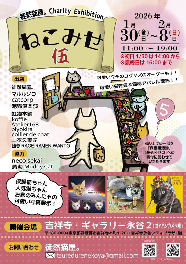 徒然猫屋。CharityExhibition ねこみせ伍 開催日 2026年1月30日(金)~ 2月8日(日) 時間 11:00~19:00(初日14:00から、最終日16:00まで) 料金など 会場:ギャラリー永谷 - 2 会場 ギャラリー永谷 Web http://www.ntgp.co.jp/rentalspace/gallery.html Instagram @tsuredurenekoya