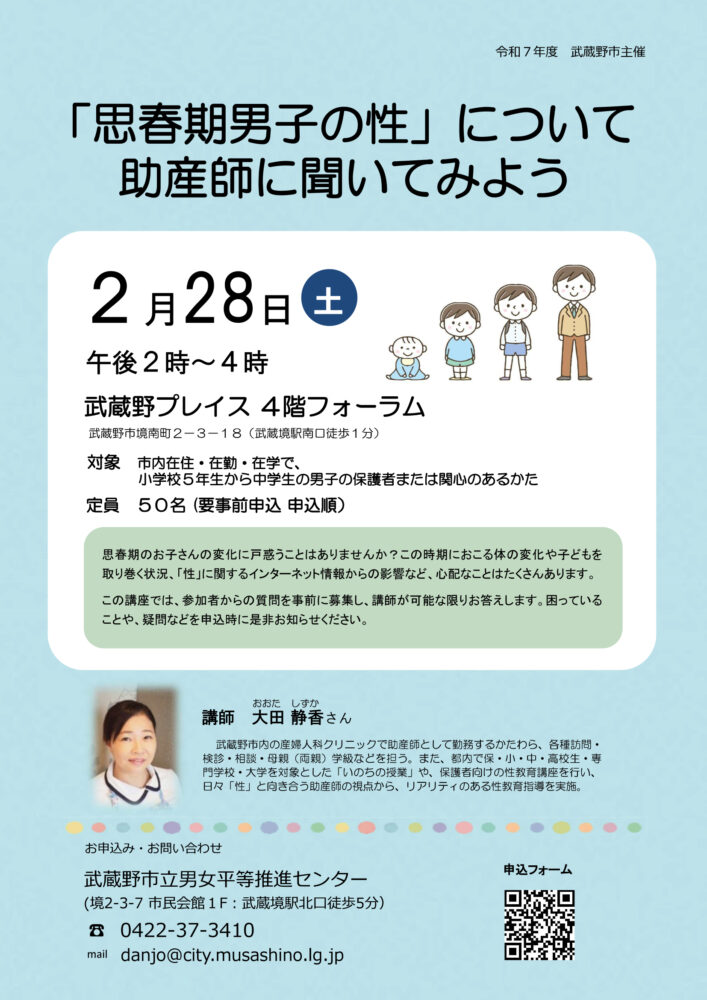 無料 対象:武蔵野市内在住・在学・在勤で、小学5年から中学生男子の保護者または関心のある方 定員:50名(申込制・先着順) 会場:4階フォーラム