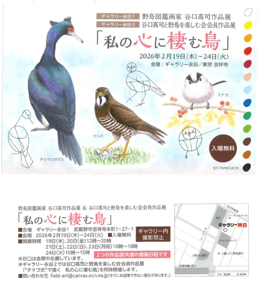野鳥図鑑画家 谷口高司氏 作品展「私の心に棲む鳥」 開催日 2026年2月19日(木)~24日(火) 時間 19日(木)・20日(金)12:00~20:00 21日(土)・22日(日)・23日(月・祝)10:00~18:00 24日(火)10:00~15:00 会場 ギャラリー永谷 Web http://www.ntgp.co.jp/rentalspace/gallery.html