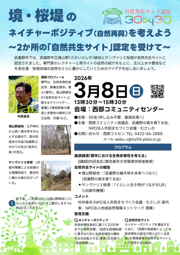 ・基調講演「都市における⽣物多様性を考える」(講師:内⽥圭⽒) ・⾃然共⽣サイトの報告 境⼭野緑地:「武蔵野の雑⽊林を未来へつなぐ」(武蔵野の森を育てる会)、サンヴァリエ桜堤:「くらしと⽣き物がつながるUR」(UR都市機構) ・コメント:村井寿夫(NPO法⼈市⺠まちづくり会議・むさしの 副代表、NPO法⼈地域⾃然情報ネットワーク 理事)
