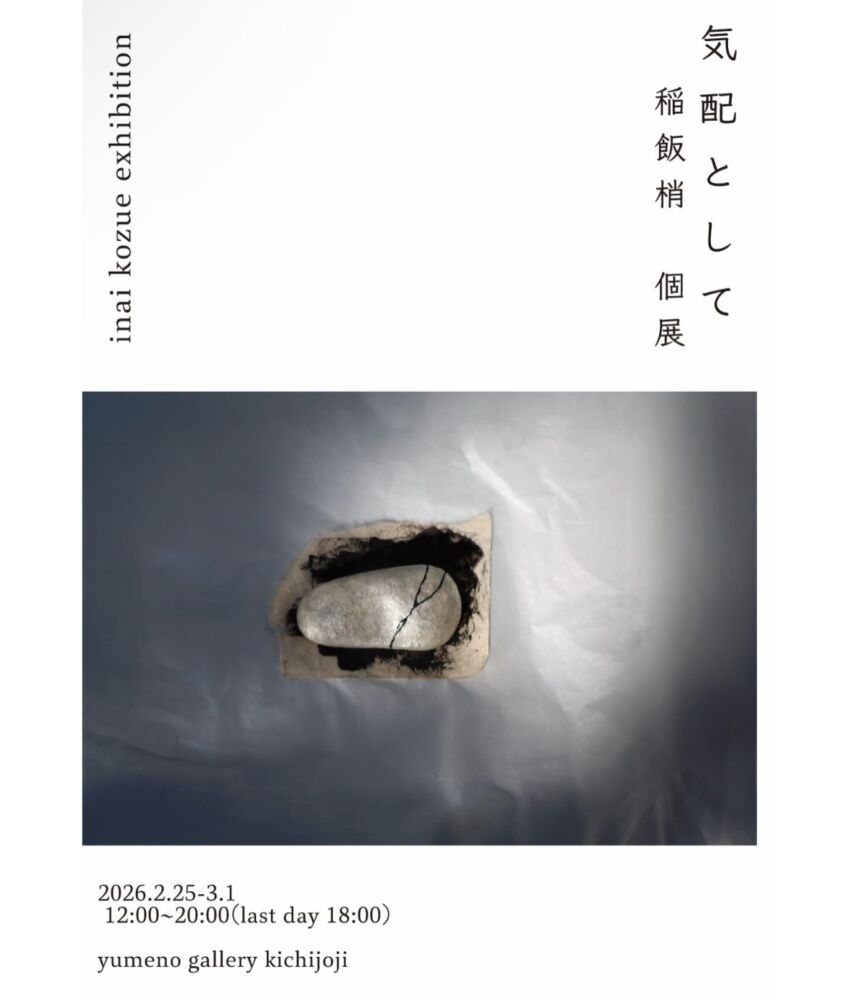 稲飯 梢 個展「気配として」 開催日 2026年2月25日(水)〜3月1日(日) 時間 12:00〜20:00(最終日18:00まで) 会場 ユメノギャラリー吉祥寺〒180-0002 東京都武蔵野市吉祥寺東町1-5-13 はぴすと押山2F Web https://www.yumenogallerykichijoji.com/schedule/